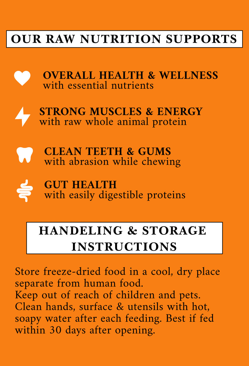 Feed freeze-dried mini nibs as is for a complete and balanced meal or mix in with other food for a boost of protein and vital nutrients. Always provide access to clean, fresh water. Keep freeze-dried products sealed and stored in a cool, dry dark place. Keep out of reach of young children and pets. Not for human consumption. Best if fed within 30 days after opening.